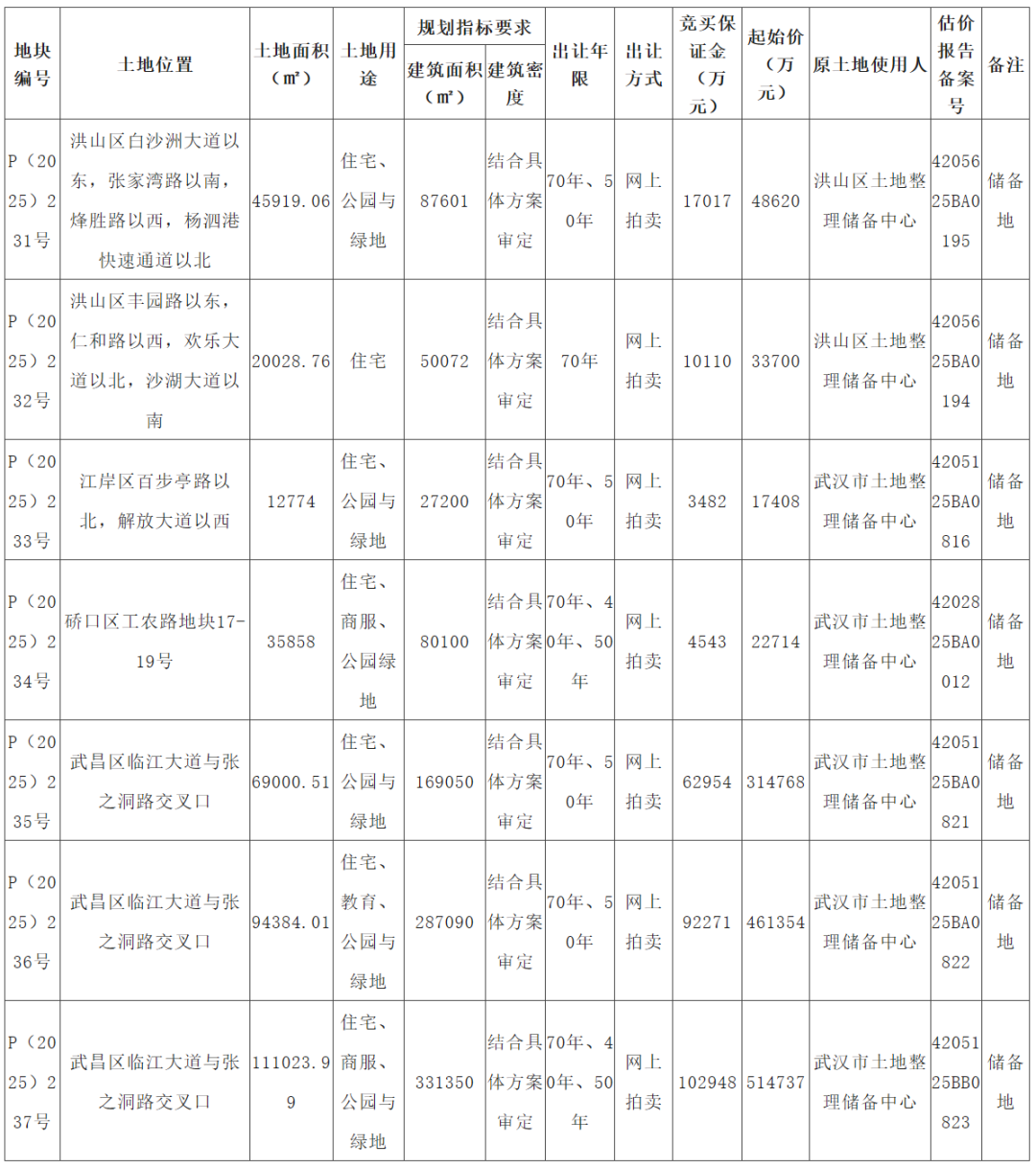 12月4日,武汉市自然资源和城乡建设局发布《武汉市拍卖出让国有建设用地使用权公告(武告字(2025年)31号)》,上架7宗涉宅用地,其中洪山区2宗、江岸区1宗、硚口区1宗、武昌区3宗,总土地面积38.90万平方米,总规划建筑面积103.25万平方米,总起始价141.33亿元,本次公告地块将于12月25日拍卖。
